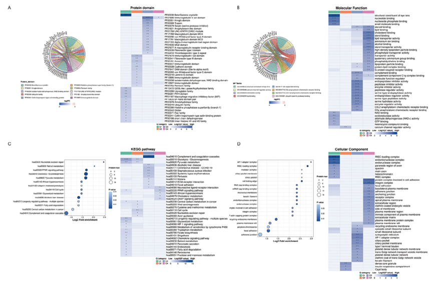 他们还分析了晶状体组织中的 DEP,通过映射到细胞成分来探索异位晶状体的潜在机制。获得的结果显示参与粘着斑、RISC负载复合物和细胞后缘的蛋白质失调(图 4D)。为了进一步基于DEP功能分类进行层次聚类,他们首先根据差异倍数将它们分为4类,称为Q1至Q4。然后,对于每个Q组,分别富集分子功能、细胞成分和KEGG通路,并进行聚类分析以发现对照组中蛋白质功能与差异表达倍数的相关性(图4A-D,右)。数据表明,AH 中与补体和凝血级联相关的 DEP 在 Q3 聚类中突出显示,而糖酵解/糖异生和丙酮酸代谢相关的 DEP 在 Q1 聚类中。