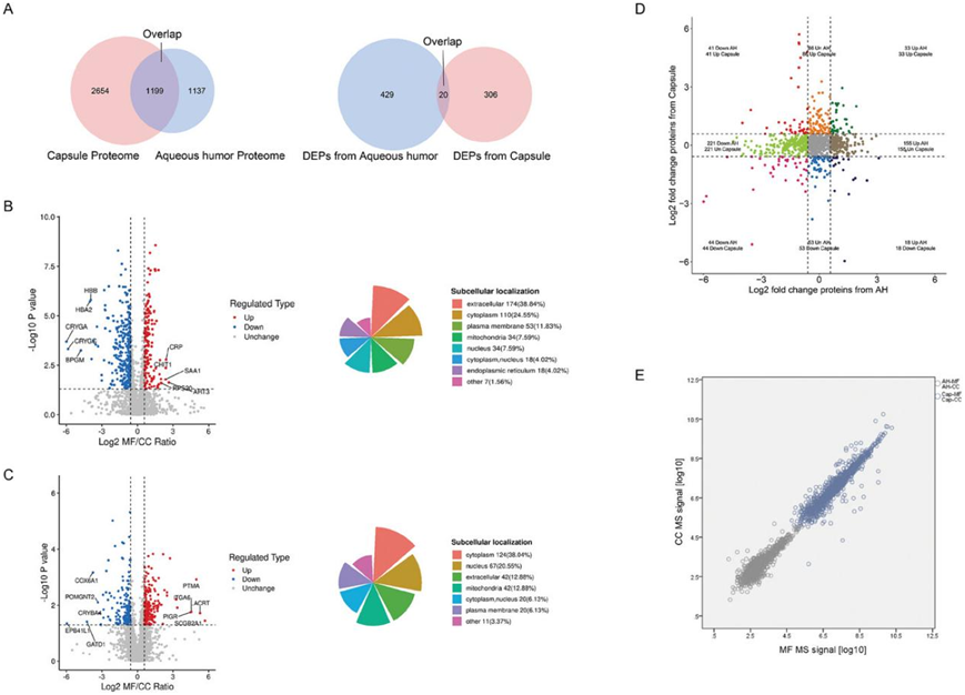 在 AH 和晶状体囊中分别鉴定出总共 2336 和 3853 个蛋白质,其中有 2300 和 2938 个可比较的蛋白质。MFS 和 CC 之间蛋白质发生了显著差异(图3B)。在 AH 中鉴定了 449 个 DEP,特别是 155 个上调蛋白和 294 个下调蛋白。其中38.84%来自细胞外间隙,这与AH的生理特性一致。此外,比较显示晶状体囊中有 326 个 DEP(38.04% 细胞质亚细胞定位),其中 178 个上调蛋白和 148 个下调蛋白(图 3C)。AH 和晶状体囊蛋白质组之间通常只有 20 个 DEP 存在丰度差异(图 3A),与常见检测到的蛋白质总数(图 3A)相比,这个数量要小得多。通过分析重叠蛋白的 Log2 FC 来详细比较它们(图3D)。在 MFS 和 CC 中的相对丰度等级之间的线性相关性(图3E)。值得注意的是,这些蛋白质在 AH 中的检测水平通常比晶状体囊中低得多,这可能反映了组织渗漏。