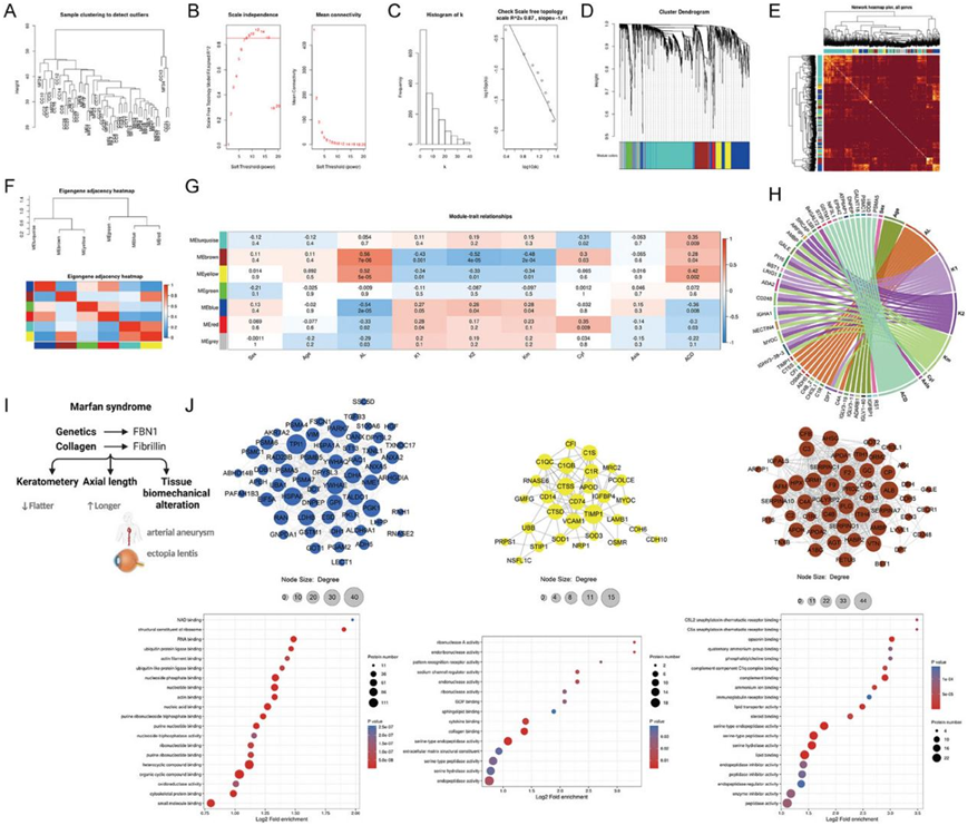 (a) 用于异常值检测的样本聚类。(b) 无标度拓扑标准的功率变换分析和评估。(c) 无标度拓扑分析。(d) 基于层次聚类树状图鉴定了高度共表达蛋白质的七个不同模块。(e) 独特模块的 TOM;红色阴影标志着网络中相关蛋白质之间共享的更高的拓扑重叠。(f) 特征蛋白树状图和热图,其中红色和蓝色分别代表特征蛋白的高相关性和低相关性。 (g) 根据模块特征基因的聚类树状图绘制模块-性状相关图。(h) 弦图显示眼部特征与每个特征中 GS 值最高的前 10 个蛋白质之间的相关性。(i) 本研究重点关注的 MFS 的临床病理学特征。(J) MEbrown、MEyellow 和 MEblue 三个核心模块中蛋白质的 PPI 网络(上)和分子功能富集分析(下)。
