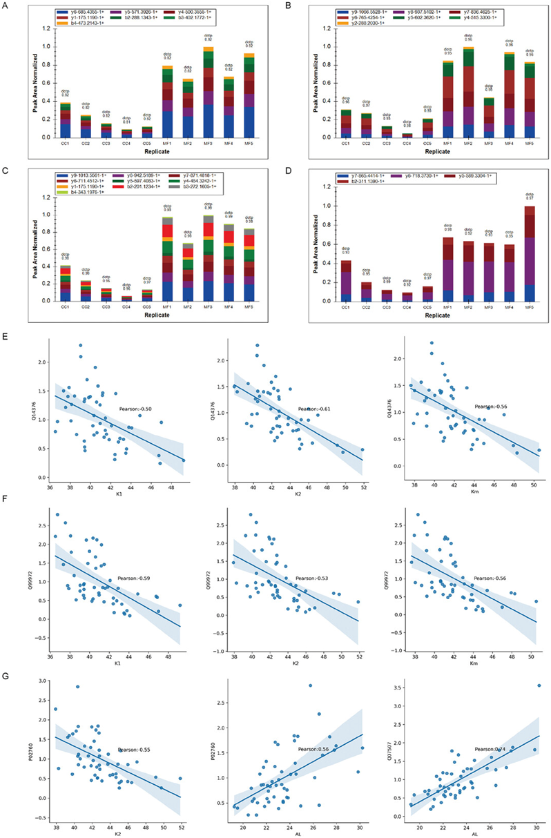 (a) 验证队列中肽 TWNAVLLR(对应于蛋白质 Q14376)的碎片离子峰面积分布。(b) 验证组中肽 ELETAYSNLLR(对应于蛋白质 Q99972)的碎片离子峰面积分布。(c) 验证队列中肽 TVAACNLPIVR(对应于蛋白质 P02760)的碎片离子峰面积分布。(d) 验证队列中肽 YFESVLDR(对应于蛋白质 Q07507)的碎片离子峰面积分布。(e-g) 临床指标与蛋白质生物标志物的Pearson相关性分析。