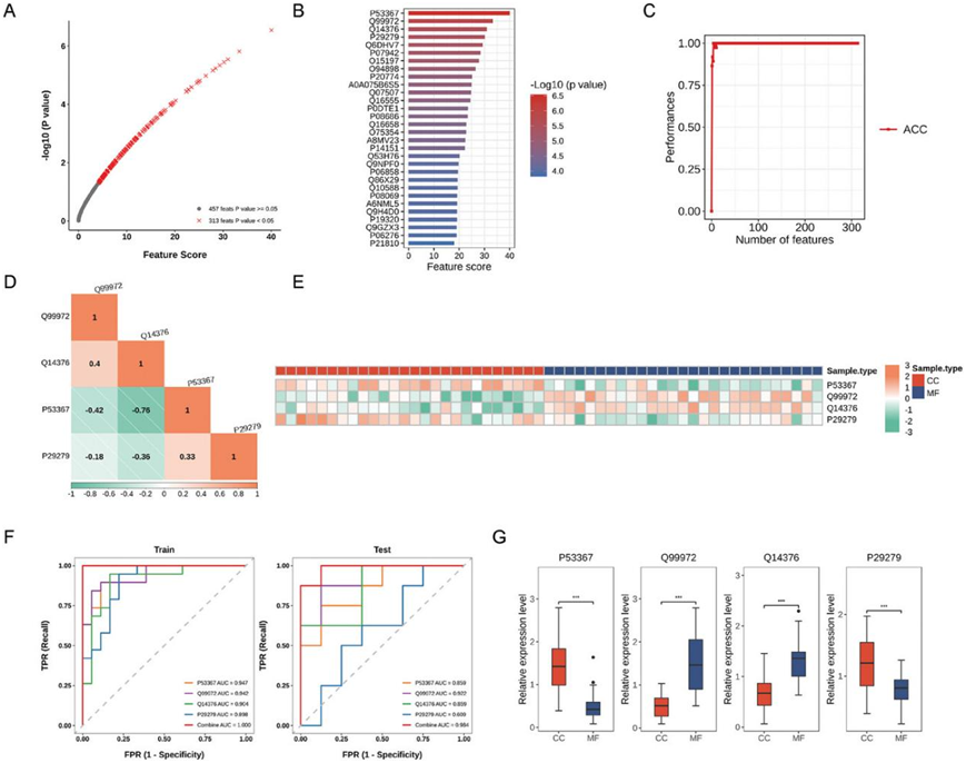 他们评估了定量蛋白质作为机器学习的输入特征,并使用 SVM 算法确定了最相关的蛋白质。他们进行了单变量特征分析,以分析每种蛋白质在区分两类患者(MFS或CC)中的重要性,并随后根据其得分和p值对其进行排序(图6A),获得了排名前30位的蛋白(图6B)。为了获得候选的最佳子集,他们采用了IFS方法(图6C)。他们使用 AUC 评估了所选蛋白质的预测性能。一组表现出最高 AUC 的候选特征是最相关的特征。使用这些蛋白质作为特征,生成了最佳的诊断模型。映射到四种不同基因产物(CCN2、ARFIP1、GALE 和 MYOC)的四个排名最高的特征在区分患者方面表现出最佳性能。他们创建了描述皮尔逊相关系数和定量水平的热图,数据表明该模型没有冗余(图 6D-E)。在测试集中,诊断模型显示组合 AUC 为 0.98(图 6F)。箱线图展示了从所有样本中获取的相对表达变化(图 6G)。
