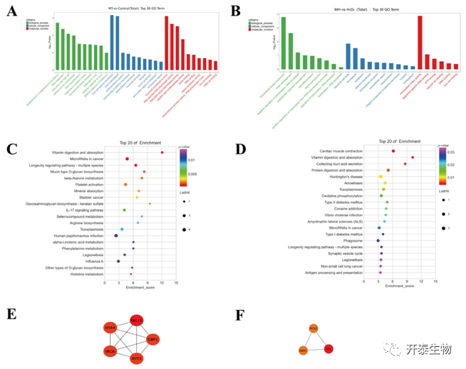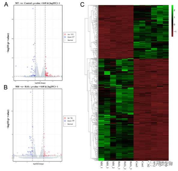 为了研究MT对基因表达的影响,作者分析了对照组、MT组、MH组和H2O2组的基因表达谱。结果表明,和对照组相比,在MT组中鉴定到178个DEGs,包括67个下调,111个上调(图4A)。和H2O2组相比,在MH组中鉴定到95个DEGs,包括59个下调和36个上调 (图4B)。DEGs的热图显示了不同组之间的基因表达谱差异(图4C)。