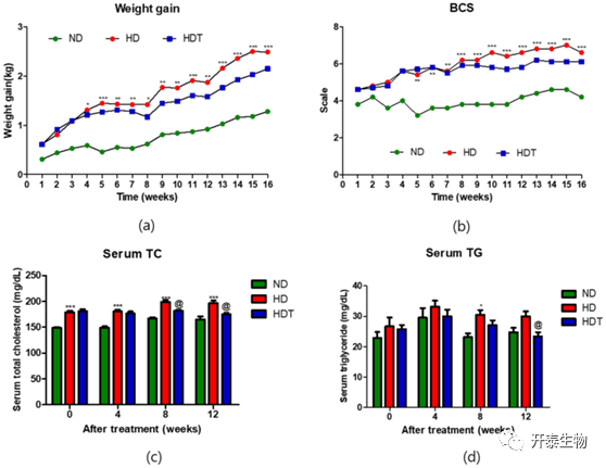 所有的犬平均初始重量为8.4±0.61 kg。高脂饲喂4周后,HD组犬的体重较ND组相比显著增加 (图1a)。和ND组相比,HD和HDT组的体况评分(BCS)显著增加。但是,和HD组相比,HDT组的BCS从第八周开始显著下降(图1 b)。这表明黑参和蚕粉可以抑制高脂诱导肥胖犬的体重增加。和ND组相比,HD组血清TC水平显著增加,但第8周和第12周时,HDT组TC水平较HD组相比显著下降(图1c);第12周时,HDT组血清TG水平显著低于HD组(图1d)。