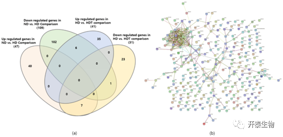 和ND组相比,HD组中NUGGC、EFR3B、RTP4、FAM83D、CDC45和ACAN基因下调;和HD组相比,HDT组中这6个基因上调。相似的,和ND 组相比,HD组中HOXC4、IL17RB、SOX13、SLC30A8、SLC18A2、RHEX和SOX4基因上调;但和HD组相比,这7个基因在HDT组中下调(图4a)。使用string数据库对DEGs构建的PPI网络分析如图4b所示。