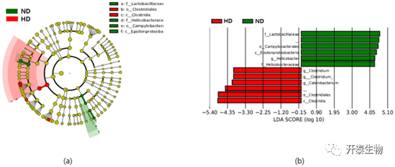 通过生成条形图和Krona图对分类结果进行分析。用Krona图比较不同处理组肠道微生物中存在的重要分类群(图8)。在门水平上,所有样本中最主要的是厚壁菌门。而梭杆菌门、拟杆菌门和放线菌等,在不同样本间普遍存在。LEfSe分析确定了ND和HD组之间的微生物群落分类差异。在HD组中,梭菌纲、梭菌目、链状杆菌属和梭菌属的成员增加;螺旋杆菌科、乳酸杆菌科、弯曲杆菌目、ε-变形菌纲和螺杆菌属的成员减少(图9a,b)。然而,HD和HDT组之间的分类群没有变化。