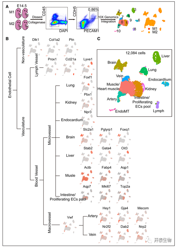 收获第 14.5 天 (E14.5) 阶段四个野生型胚胎,获得 5806 和 6278 个 eEC(胚胎内皮细胞)并整合在一起。通过聚类分析确定了 11 个簇,并且从 M1和 M2分离的细胞得到了很好的整合(图 1A)。在各种器官或组织中建立的内皮细胞标记用于注释每个簇(图 1B)。脉管系统中的 EC 由血管 EC 和淋巴 EC 组成。大血管中的内皮细胞进一步分类为动脉内皮细胞和静脉 ECs。Foxf1 在肺 ECs38中高度表达,肾 EC 表达更高的基因Pbx1,Npr3 是心内膜的标记基因。Stab 2、Gata4 和 Oit3 在肝 ECs中高度表达。来自心脏的部分 aEC 与定义为心内膜的 eEC 重叠,这与心脏中 EC 的解剖分布一致。某些基因(肌肉中的 Actb、Fabp4和肠道 EC 中的 Apq710)分别在簇 0 和簇 1 中富集(图 1B)。作者推测簇 0 为肌肉 eEC,簇 1 为肠ECs 池。利用已发表的成年小鼠数据集,作者在图 2B 中用红色字体突出显示了一些基因,与 aECs 相比,这些基因在 eECs 中的表达相对较高。