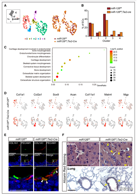 间充质转运的 EC中簇 3 和簇 4 在 miR-126-ecKO eECs 中变化最大(图 6A-B)。第 3 组中 DEG与细胞外基质组织和骨骼系统发育相关的条目相关(图 6C)。富含细胞外基质和软骨的基因也在簇 3 中高度表达(图 6D)。miR-126 敲除 eECs 中存在过量的 EndoMT (内皮-间充质转化)(图 6E)。染色表明 miR126-ecKO 小鼠脑和肺中的血管钙化增加(图 6F)。