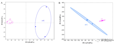 作者对6个大蒜样品的差异进行主成分分析(PCA),基于基因和蛋白表达的PCA样本分布图如图3A和图3B所示。4℃和30℃保存的大蒜样品明显分为两个不同的集群,这表明在不同温度下保存的大蒜在基因和蛋白质水平上都有显著的差异。