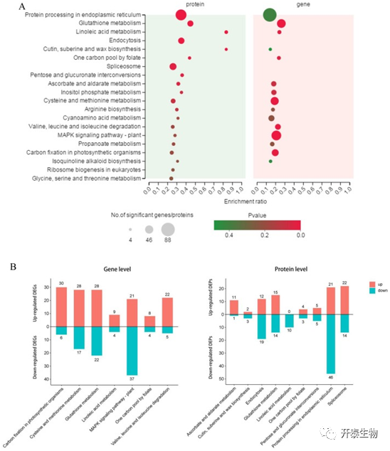 此外,在谷胱甘肽代谢中有28个下调DEGs和14个下调差异蛋白;在氨基酸代谢中有50个上调DEGs,22个下调DEGs;在光合生物的碳固定(能量代谢)和MAPK信号通路中,分别有30个和21个上调DEGs,6个和37个下调DEGs(图6B)。