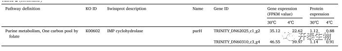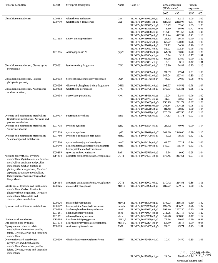 为探究低温调节大蒜变绿的具体分子机制,作者从参与谷胱甘肽代谢、半胱氨酸和蛋氨酸代谢、亚油酸代谢和叶酸碳库等通路的因子中,筛选出基因和蛋白表达趋势一致的因子(表2)。研究表明,谷胱甘肽还原酶(GR)可以催化氧化型谷胱甘肽(GSSG)转变为还原型谷胱甘肽(GSH),而谷胱甘肽过氧化物酶(GPX)发挥相反的作用。与30℃保存的大蒜相比,4℃保存的大蒜中GR的表达下降,而GPX的表达增加(表2),这可能诱导大蒜组织中的GSSG增加,以抑制自由基的产生,避免质膜过氧化,以应对低温胁迫。
