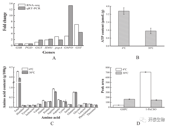 作者检测了与低温调节大蒜变绿有关的关键因子的表达水平和关键代谢物的含量,对谷胱甘肽代谢相关基因的RT-qPCR分析表明,与30℃保存大蒜相比,4℃保存大蒜中IDH1、pepA、G6PD、GST和GGT的表达上调,而GSR和PGD表达下调(图7A),这与RNA-seq数据一致。4℃保存的大蒜中,ATP含量显著高于30℃保存的大蒜,说明低温贮藏通过TCA循环和HMS途径为大蒜发绿提供了能量(图7B)。总的来说,4℃保存大蒜的氨基酸含量高于30℃保存大蒜,尤其是丙氨酸、精氨酸和天冬氨酸(图7C),说明低温贮藏可以促进大蒜中氨基酸的积累,为大蒜的绿变提供充足物质基础。丙烯基半胱氨酸亚砜(1-PeCSO)是大蒜变绿过程中主要的色素前体物质,可由原花青素(GSPC)转化。在4℃的大蒜中,GSPC较少,而1-PeCSO较多(图7D),这解释了4℃保存下大蒜变绿的现象。