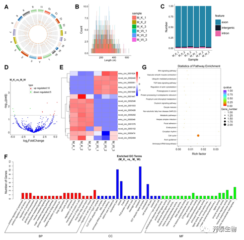 为了了解 XBP1 相关 circRNA 在软骨发育中的作用,使用野生型小鼠 (CON) 和 XBP1 CKO 小鼠的 rRNA 缺失软骨细胞样本进行了 circRNA 测序。获得了1651个新的circRNA,它们广泛分布在21条染色体上,分别命名为mmu_circ_0000004到novel_circ_0003429(图3A)。分析显示,大多数 circRNA 的长度范围为 200 至 400bp(图 3B)。通过统计所有样本中 circRNA 的来源,发现 95.08% 的 circRNA 由外显子组成,而 3.34% 和 1.58% 分别位于内含子和基因间区域(图 3C)。为了鉴定可能参与软骨发育的 circRNA,分析XBP1 CKO 小鼠和野生型小鼠之间 circRNA 表达模式的差异。共观察到15个差异表达的circRNA,包括10个上调和5个下调的差异表达circRNA(图3D)。对 15 个差异表达的 circRNA 进行层次聚类分析并分类为不同的簇(图 3E)。GO分析显示,细胞周期过程的调节、胞质分裂和细胞分裂的正调节、胞质分裂的调节、细胞周期停滞、胞质分裂和细胞内定位的维持在BP类别中富集。其余两类中的主要功能包括CC类中的细胞质和细胞质部分以及MF类中的嘌呤核糖核苷三磷酸和酶调节剂活性(图3F)。KEGG 通路分析揭示了这些 circRNA 的功能,显示细胞周期通路和代谢通路激活(图 3G)。