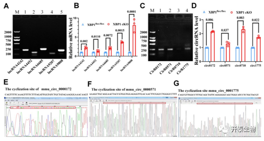 为了确认通过Illumina测序获得的RNA的表达水平,选择了5个lncRNA并使用RT-PCR检测它们的表达水平(图6A)。此后,从XBP1 CKO和对照小鼠中分离出软骨组织,并检测了不同软骨组织中5个lncRNA的mRNA水平。qPCR显示在 XBP1 CKO 小鼠的软骨中5个lncRNA的表达上调(图 6B)。作者选择了四种 circRNA,检测它们的表达和环化位点。RT-PCR、qPCR和circRNA测序结果与Illumina测序结果一致。如图6 C-G所示,环化位点通过circRNA测序确定,与对照组相比,XBP1 CKO小鼠软骨中三种circRNA的表达上调。所有随机选择的 lncRNA 和 circRNA 在 qPCR 和 Illumina 测序之间显示出相似的表达模式。此外,RT-PCR、qPCR 和 circRNA 测序结果均证实测序数据的准确性和可靠性。