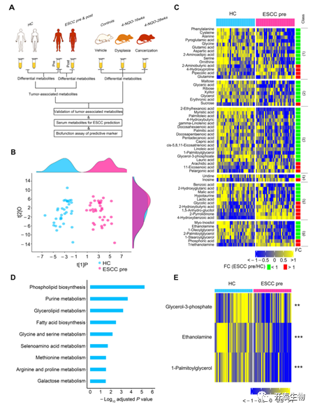 A.研究设计;B. ESCC和HC在术前血清中的整体代谢差异; C.热图显示术前ESCC与HC差异表达的58种血清代谢物,(1)氨基酸,(2)碳水化合物,(3)脂肪,(4)核苷酸,(5)有机酸,(6)未分类; D.代谢途径富集分析;E.热图显示术前ESCC和HC参与磷脂生物合成途径的差异代谢物。