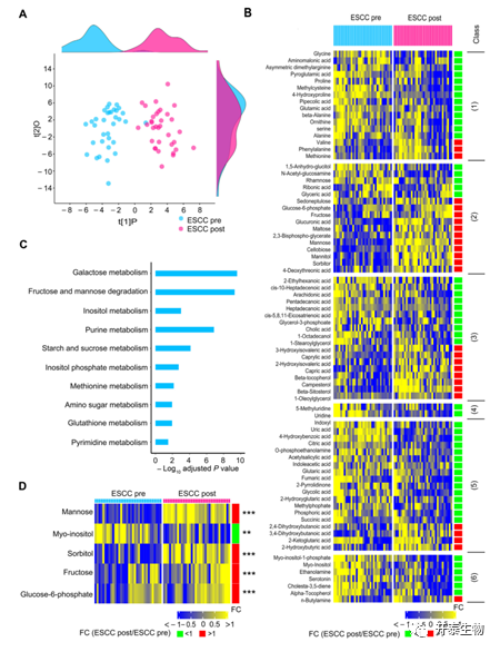 ESCC患者从术后第1天开始禁食和持续性肠外营养,术后第3天采集血清,并与术前进行对比,发现术后血清表现出明显的代谢改变, (R2Y=0.84,Q2=0.76)(图2A),有 78种代谢产物的水平发生了显著变化(P<0.05),包括16种氨基酸、16种碳水化合物、18种脂质、2种核苷、19种有机酸和7种未分类代谢产物(图2B),这表明食管切除加上术后禁食和肠外营养可能对ESCC患者的整体代谢产生明显影响。随后,作者对这78种代谢物进行了MSEA,与术前相比,术后血清中10条代谢途径的活性显著波动(P<0.05)(图2C)。值得注意的是,半乳糖代谢是最受干扰的途径,参与这一途径的五种代谢物中有四种的水平增加,而术后血清中剩余代谢物的丰度受到抑制(图2D)。