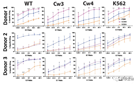 UCB34和UCB56 NK细胞KIR表型鉴定完毕后,作者想进一步确认KIR+UCB56和KIR-UCB34 NK细胞的细胞毒性是否有差异。于是作者选用了不表达HLA,B,C的淋巴母细胞作为WT靶细胞组,将该淋巴母细胞转基因表达KIL的配体HLA C1形成的细胞作为Cw3组,将淋巴母细胞转基因表达KIL的配体HLA C2形成的细胞作为Cw4组,将不表达MHCⅠ类分子的K562细胞作为检测NK细胞杀伤功能的阳性对照,将KIR+外周血来源的NK(PBNK)作为效应细胞的阳性对照。效应细胞与靶细胞按照特定的比例共孵育后,检测各组效应细胞的细胞毒性。作者发现三个供体对所有的靶细胞中,KIR+UCB56的细胞毒性都强于KIR-UCB34 NK细胞,另外转基因表达HLA C1和HLA C2的Cw3和Cw4组都会抑制UCB34和UCB56 NK细胞的毒性。