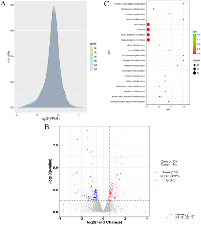 每个样本获得了约43000000~49000000个clean reads,70%~79%质检合格的序列比对到参考基因组,比对率为84%。CK与ND组之间的基因表达水平是相似的(图1A),说明可用于差异表达分析。和CK组相比,在ND组中共筛选了235个差异表达基因(DEGs),其中96个上调(包括MFS通用底物转运体、细胞色素P450和丝氨酸蛋白酶抑制剂),139个下调(包括胚胎发生晚期丰富结构域蛋白、醛酮还原酶和α/β水解酶,图1B)。