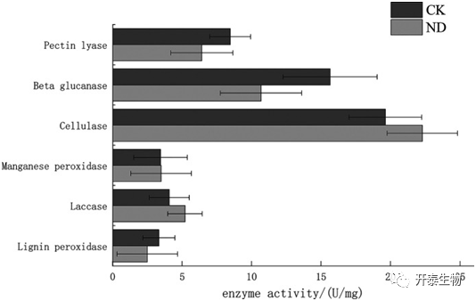作者最后分析了木屑堆肥对香菇棕褐色菌膜木质纤维素降解相关酶活性的影响,结果表明:果胶裂解酶活性范围约5至10 U mL−1,β-葡聚糖酶的活性范围为10至20 U mL−1,纤维素酶的活性范围约16至25 U mL−1,锰过氧化物酶、漆酶和木质素过氧化物酶的活性低于约7 U mL−1(图6)。CK组和ND组的酶活性无显著差异。