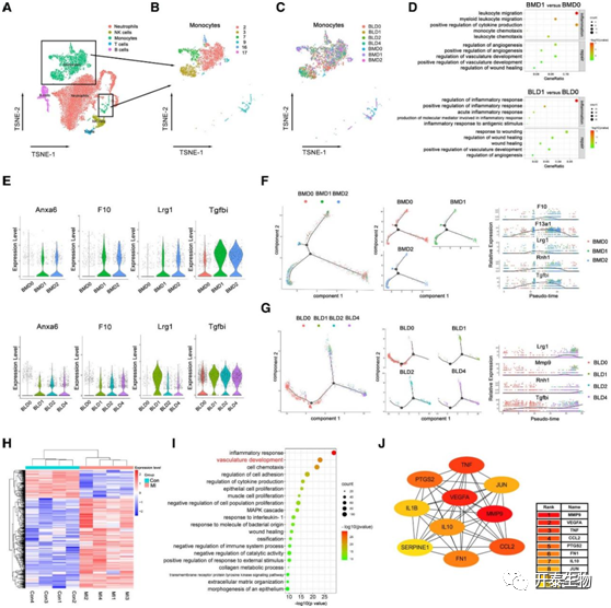 A-G,MI小鼠骨髓和外周血单核细胞单细胞测序;H-J,MI第1天外周血单核细胞RNA-seq测序。