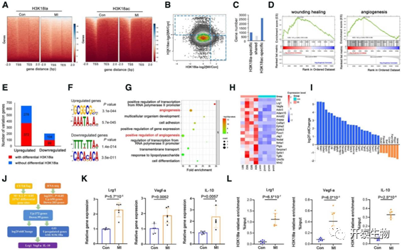 筛选组蛋白乳酸化候选靶基因,使用H3K18la、H3K18ac抗体对单核细胞进行CUT&Tag检测,数据显示H3K18la富集在基因的启动子区域(图3 A),这些基因中只有14%的基因同时显示H3K18la和H3K18ac显著增加(图3 B-C)。此外,基因集富集分析显示H3K18la结合的基因在很大程度上与血管生成和伤口愈合相关,并且上调的基因积极参与血管生成的正向调控(图3 D-I)。最后将Vegf-a、IL-10和Lrg1作为乳酸化的潜在靶基因(图3 J-L)。
