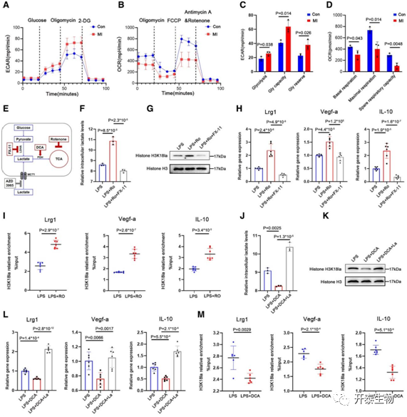 A-D,MI小鼠单核细胞基础细胞外酸化率和耗氧率测量;F-I,鱼藤酮处理细胞后,细胞内乳酸、H3K18la水平和修饰基因的表达;J-M,二氯乙酸钠处理细胞后的变化。