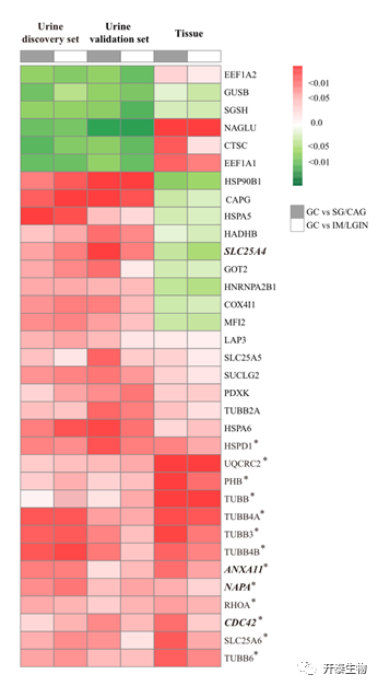图4 对34个选定的蛋白在GC和癌前病变之间的尿液和组织水平的表达的系统聚类。与GC呈正相关(OR>1)的蛋白质以红色表示,呈负相关(OR<1)的以绿色表示,与胃癌风险显著相关的组织蛋白用*标记。