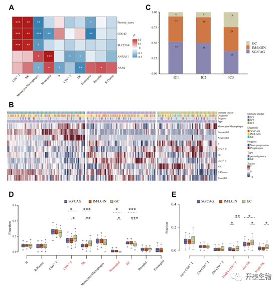 根据每个患者免疫细胞的估计比例得出三个免疫簇(IC)(图6a),三者中10个主要免疫细胞的丰度在统计学上都有显著差异,中性粒细胞具有最低的P值(图6b)。而且他们在免疫细胞类型上有不同特征,IC1以高比例的CD4+T细胞和树突状细胞为特征,IC2以丰富的嗜酸性粒细胞和中性粒细胞为特征,IC3以丰富的CD8+T、NK细胞和B细胞为特征(图5b,6b)。