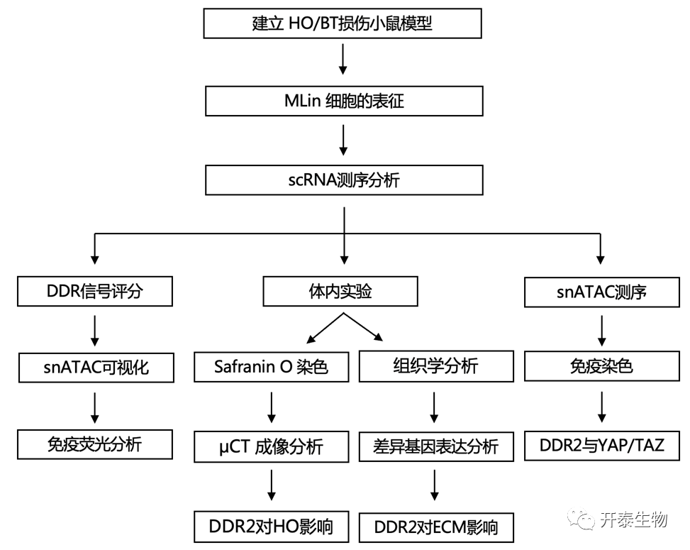研究者团队通过一系列转录组学和蛋白质组学分析,确定了DDR2是 HO 形成中的关键 MLin 细胞调节因子。可通过组成型或条件型敲除Ddr2以及药物靶向抑制DDR2信号通路,来减少小鼠体内 HO 的形成。从机制上讲,DDR2 会改变FAK方向和随后的基质组织,调节FAK 和YAP/TAZ介导的 MLin 细胞信号传导,Ddr2缺失会降低FAK/YAP/TAZ 依赖性通路中的 MLin 细胞的成骨分化、HO 形成和胶原排列。因此,ECM-DDR2 相互作用对于驱动 HO 至关重要,并且可以作为治疗该疾病过程的先前未知的治疗靶点。