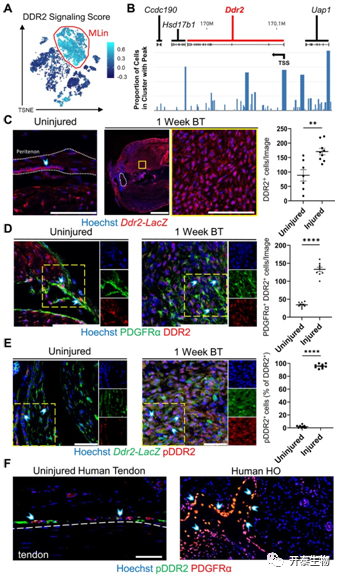 (A)TSNE可视化显示DDR2 信号评分。(B) Ddr2和周围基因轨迹的 snATAC 测序可视化。(C) BT 后 1 周Ddr2-LacZ报告小鼠未受伤肌腱和损伤部位的代表性共聚焦图像 (63×)。(D) 野生型 C57B6 小鼠 BT 后 1 周未受伤肌腱和损伤部位的代表性共聚焦图像 (63×)。Ddr2-LacZ小鼠BT 后 1 周未受伤肌腱和损伤部位的代表性共聚焦图像 (63×)。(F) 用 Hoechst、抗 PDGFRα 和抗磷酸化 DDR2 (pDDR2) 染色的未受伤人肌腱和成熟人 HO 组织的代表性共聚焦图像 (20×)。
