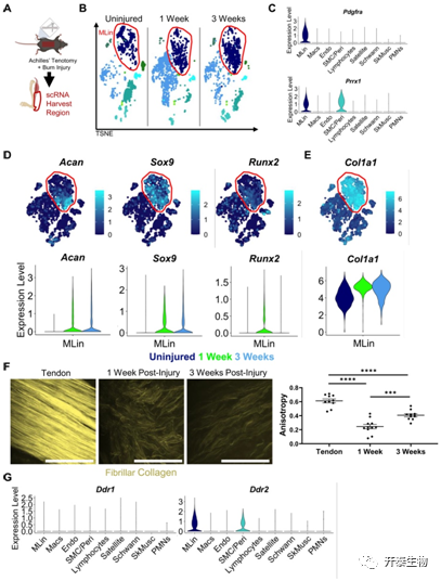 研究者团队建立了HO /腱切断术 (BT) 损伤的小鼠模型 (图1A), 在三个时间点(未受伤、受伤后 1 周和受伤后 3 周)从肌腱损伤部位采集细胞用于单细胞 RNA (scRNA) 测序分析(图1A-B)。通过差异基因表达分析在收获的细胞群中表征各种细胞群, 发现MLin 细胞的特征性表达Pdgfrα 和Prrx1(图1C),同时软骨形成分化标志物Acan和Sox9以及早期成骨标志物Runx2的表达增加并伴随着纤维状胶原蛋白基因Col1a1的显著增加(图1D-E)。二次谐波生成 (SHG) 成像显示,在BT后损伤部位1周内,胶原高度无序(反映为纤维各向异性水平较低),3周时纤维逐渐对齐排列,尽管相对于未损伤对照组仍明显无序(图 1F)。这些发现突出了 MLin 细胞沿着骨软骨谱系的进展,伴随着肌腱损伤后胶原蛋白沉积和组织的增加。