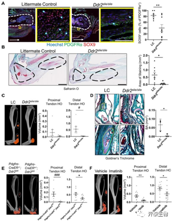 接下来研究者团队采用了具有 Ddr2 整体缺失的小鼠 (Ddr2 slie/slie)且进行了BT损伤处理,并与同窝对照 (LC) 进行比较。他们首先使用免疫荧光成像观察到在Ddr2 slie/slie小鼠受伤后 表达 PDGFRα 的 MLin 细胞的平均百分比下降了51.88%(图3A),且软骨形成减少(图3B)。又利用显微计算机断层扫描 (μCT) 成像发现Ddr2slie/slie小鼠受伤的后肢在9周后,成骨作用显著下调且HO形成显著减少(图3C-3E)。在受伤后立即每天用伊马替尼(DDR2抑制剂)治疗16天的 C57B6 小鼠中,损伤后近端和远端残余肌腱以及跟骨 HO 形成显著减少(图3F)。这些结果表明,DDR2 缺失或抑制会阻止成骨,并且可减少体内HO 形成。