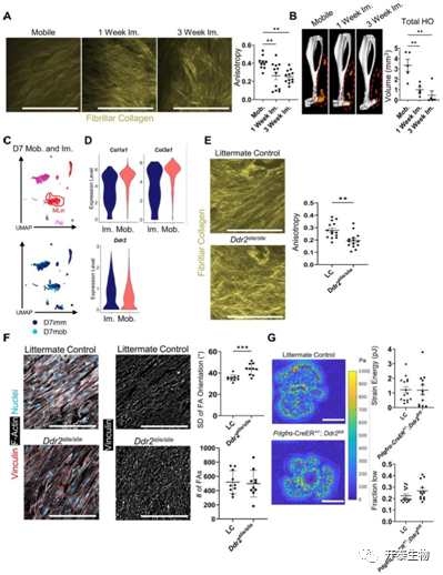(A) 小鼠损伤部位纤维胶原的 SHG 成像。(B) BT 后 9 周野生型小鼠移动或固定受伤后肢的 μCT 成像。(C) UMAP 图和(D)小提琴图显示从损伤部位采集的细胞scRNA测序中Col1a1、Col3a1和Ddr2的相对表达。(E)BT 后 1 周在 LC 和Ddr2 slie/slie小鼠中损伤部位纤维胶原的 SHG 成像。(F) MLin 细胞的代表性共聚焦图像 (40×)。(G)牵引力显微热图。