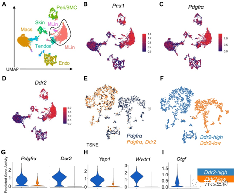 (A) UMAP 图显示从 BT 后第 0 天、第 7 天和第 42 天的损伤部位采集的细胞的 snATAC 分析中识别出的细胞簇。(B-D) UMAP 图显示了Prrx1、Pdgfr α 和Ddr2的预测基因活性。(E) TSNE 图可视化。(F) TSNE 图显示标记的Ddr2 簇。(G-I) 小提琴图显示预测基因活性Ddr2 -high 和 -low 簇中的Pdgfr α、Ddr2、Yap1、Wwtr1和Ctgf。