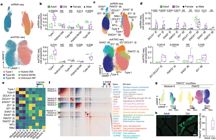 (a) 根据肌纤维类型特异性分类对 snRNA-seq(上)和 snATAC-seq(下)中的肌核进行 UMAP 分析。(b) 根据 snRNA-seq(上)和 snATAC-seq(下)中分类的肌纤维类型对成人(绿色)和老年人(紫色)个体的肌核比例进行定量。(c) snRNA-seq(上)和snATAC-seq(下)数据的肌核亚群的UMAP分析。(d)对成人和老年人中检测到的肌核亚群比例进行定量。(e) 每个模块中共表达基因的每个肌核群体中的缩放聚合表达水平。(f) 共表达模块的基因表达水平。(g) 模块8(左)和TNNT2基因表达(中)及其基因评分(右)的聚合表达水平的UMAP分析。 (h) 免疫荧光分析。