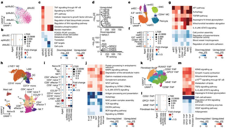 (a) 对 snRNA-seq 数据中检测到的 MuSC 亚群进行 UMAP 分析。(b) 每个 MuSC 亚群随衰老(第 1 列)和每种单细胞模式(第 2-4 列)的相对比例变化。(c) 每个 MuSC 亚群的成人和老年人组之间获得的 DEG 的功能富集分析。(d) 随着衰老(老年人与成人),qMuSC 中上调(上)和下调(下)峰值的 TF 基序富集。 (e) 血管细胞亚群的UMAP分析。(f) 血管细胞亚群的相对比例变化。(g) 血管细胞亚群的 DEG的功能富集分析。(h) 免疫细胞亚群的UMAP分析。 (i) 免疫细胞亚群的相对比例变化。(j) DEG的功能富集分析。(k) 基质细胞亚群的UMAP分析。(l) 基质细胞亚群的相对比例变化。(m) DEG的功能富集分析。