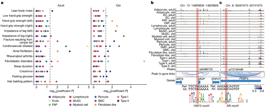(a) 通过对成人(左)和老年人(右)年龄组之间每种细胞类型内映射的 snATAC-seq 峰进行 LDSC 分析获得的复杂性状的差异富集。(b-c) 基因组浏览器轨迹(上)显示了成人和老年肌肉中每个细胞群(行)与MGP位点的遗传变异rs6488724和FKBP5位点的rs73746499相关的标准化聚集信号。
