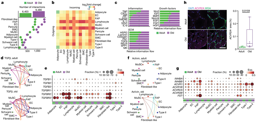 (a) 成人(绿色)和老年人(紫色)年龄组中每种细胞类型的预测相互作用(L-R 对)的数量。(b) 每种细胞类型的发送信号(传出,水平侧)和接收信号(传入,垂直侧)数量随老化的差异倍数。 (c) 成人(绿色)和老年人(紫色)年龄组中每个描绘的交互组的所有对之间的交互概率差异(相对信息流)的总和。(d) 成人(上)和老年人(下)的 TGFβ 信号网络。(e) 成人(绿色)和老年人(紫色)肌肉中与 TGFβ 信号通路相关的基因的表达水平。(f) 信号网络。(g) 激活素信号通路和肌肉萎缩相关基因的表达水平。(h)免疫荧光分析。