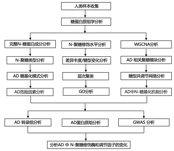 阿尔茨海默病 (AD) 是最常见的痴呆症,其病理特征是大脑中淀粉样蛋白 - β (Aβ) 斑块和 tau 神经原纤维缠结的积累。全基因组关联研究 (GWAS) 已确定了 40 多个 AD 遗传风险位点,转录组和蛋白质组分析揭示了 AD 大脑中 RNA 和蛋白质表达变化比 Aβ 和 tau 积累更广泛。然而,仅 DNA 变异和 RNA 或蛋白质水平变化不足以解释 AD 病理学的所有方面,但目前对人脑中糖基化蛋白质或糖型及其在AD中的改变的了解仍然有限。