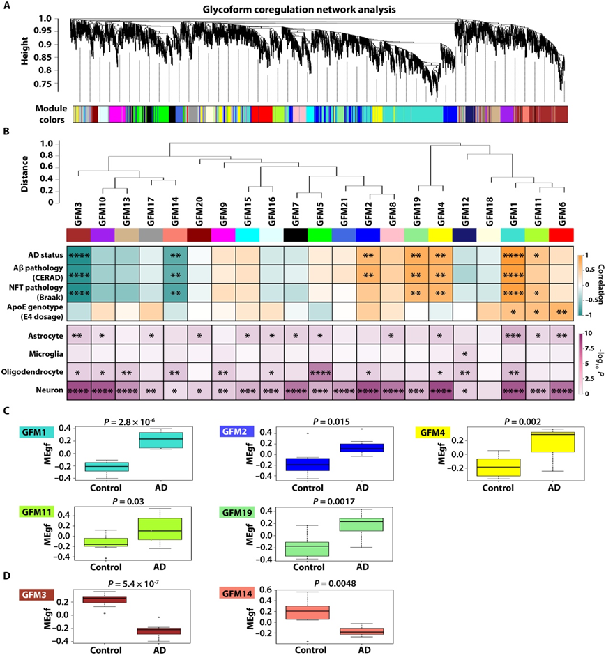 聚糖修饰共调节网络分析揭示了与 AD 病理学相关的聚糖模块