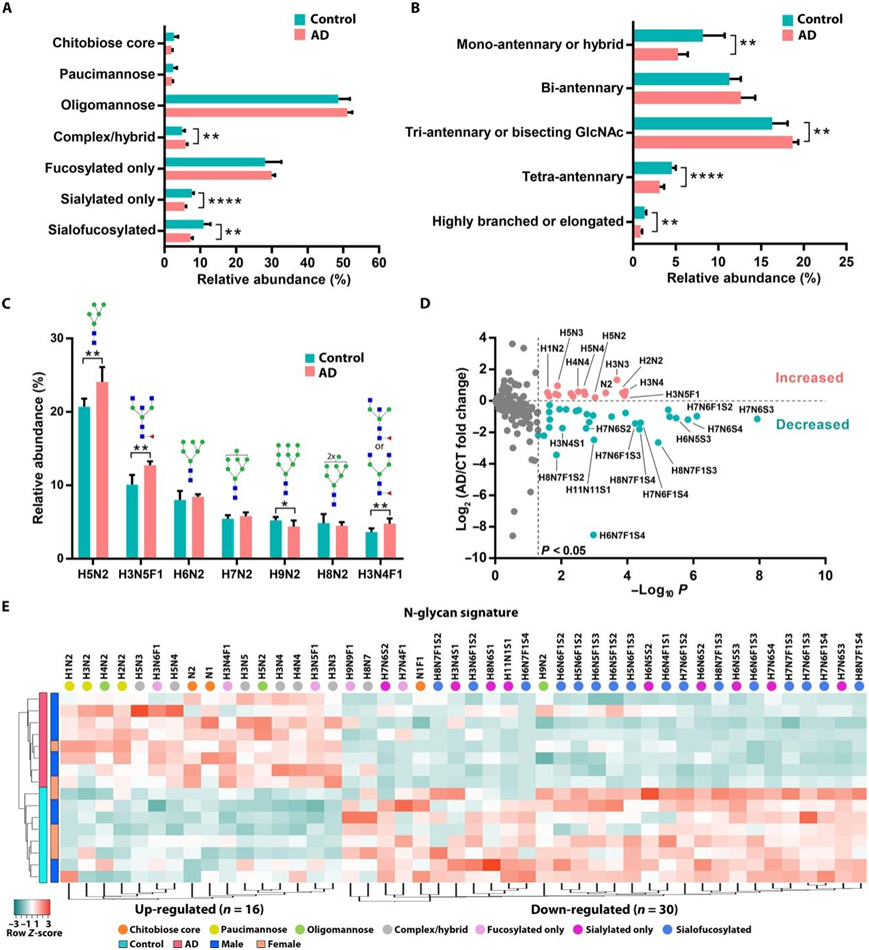 图3. AD 中 N-聚糖修饰总体水平与疾病相关的变化。