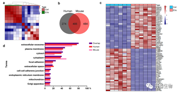 与来自肺组织的细胞相比,肺 EV 显示出不同的蛋白质谱。除了经典的 EV 标志物(CD9、CD81)外,还鉴定了肺特异性 EV 标志物(GPRC5A、AGER)。与 EV 中的典型蛋白质相比,在肺细胞中检测到更高水平的位于细胞骨架(如 TUBB)和细胞质(如 AHGDIB)的蛋白质。此外,人类和鼠肺 EV 的蛋白质组相似,检测到的蛋白质中有一半以上是共享的。对分析鉴定的蛋白质进行GO富集分析,无论物种如何,肺 EV 蛋白中细胞外泌体、质膜和胞质溶胶等GO条目高度富集,证明 EV 中蛋白质的囊泡和细胞外性质。