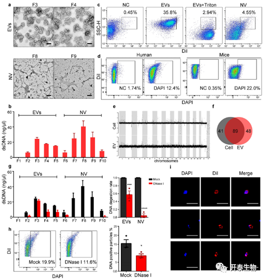 用DNaseI处理以降解附着在外膜上的DNA,导致总DNA减少约40%。流式结果显示DNase I处理后DAPI阳性颗粒类似减少。在DNase I处理后,在非囊泡成分中几乎没有检测到dsDNA。使用核酸染色剂来标记存在于EVs外部或表面的DNA。结果显示,40%的肺EV为阳性。用DAPI和DiI染色后,观察到DNA和囊泡膜结构的共定位(图4 G-I)。