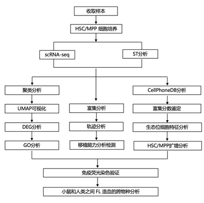高度血管化的胎儿肝脏 (FL) 是各种造血细胞 (HC) 的短暂发育场所。在小鼠中,早期定植于 FL 的 HC 包含卵黄囊红髓系祖细胞 (EMP),它将产生红系 - 髓系谱系,包括巨噬细胞。随后,主动脉-性腺-中肾 (AGM) 来源的 HSC 迁移到 FL 中进行成熟、扩增和分化。FL 结构生态位细胞,包括内皮细胞 (EC)、基质细胞和成肝细胞,通过多种生长因子、细胞因子和趋化因子与 HSC/MPP 相互作用。
