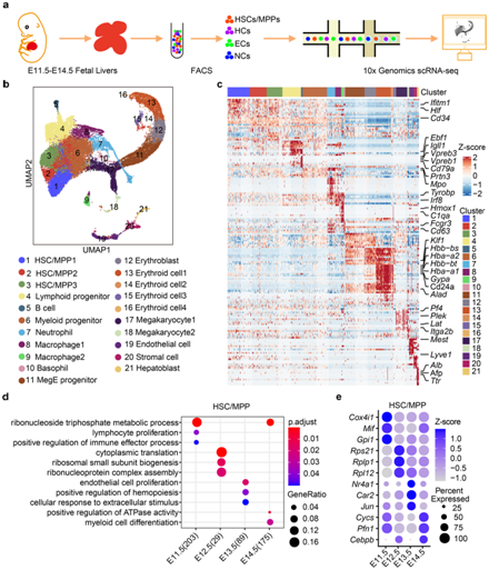 (a) FL的组织处理、细胞分离和scRNA-seq分析程序示意图。 (b) 用细胞团在FL中着色的所有单个细胞的UMAP可视化。 (c) 热图显示每个聚类前 20 个 DEG 的表达。(d) GO分析。(e) FL 发育过程中 HSC/MPP 中富集 DEG 的点图。