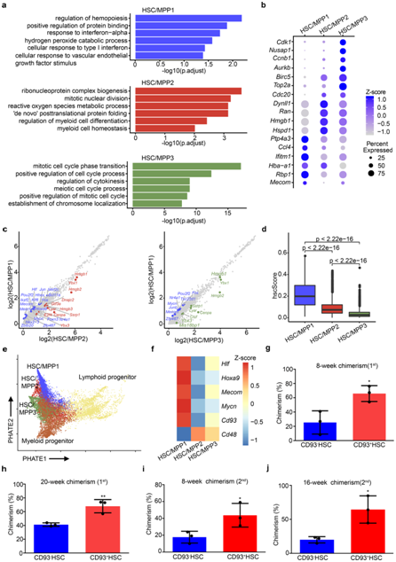 (a) 三种HSC/MPP亚型间的GO分析。(b) 三种 HSC/MPP 亚型中富集 DEG 的点图。 (c) HSC/MPP1 与 HSC/MPP2(左)或 HSC/MPP3(右)中所有基因表达的散点图。差异表达的转录因子是彩色的。 (d) 箱线图显示三种 HSC/MPP 亚型中的 hscScore 分布。(e) 通过PHATE进行轨迹分析,分别重建HSC / MPP向淋巴祖细胞和髓祖细胞的谱系分化。(f) 热图显示三种HSC/MPP亚型中HSC/MPP特征基因和Cd93的表达模式。 (g) 使用 CD93+ SLAM-LSK (CD93+ HSC) 和 CD93– HSC进行初次移植后 8 周,受体外周血 (PB) 中供体衍生的嵌合。 (h) 使用 CD93 + HSC 和 CD9 – HSC进行初次移植后 20 周,受体 PB 中出现供体衍生的嵌合。 (i) 使用 CD93 + HSC 和 CD93 – HSC进行二次移植后 8 周,受体 PB 中出现供体衍生的嵌合。(j) 使用 CD93 + HSC 和 CD93 – HSC进行二次移植后 16 周,受体 PB 中出现供体衍生的嵌合。