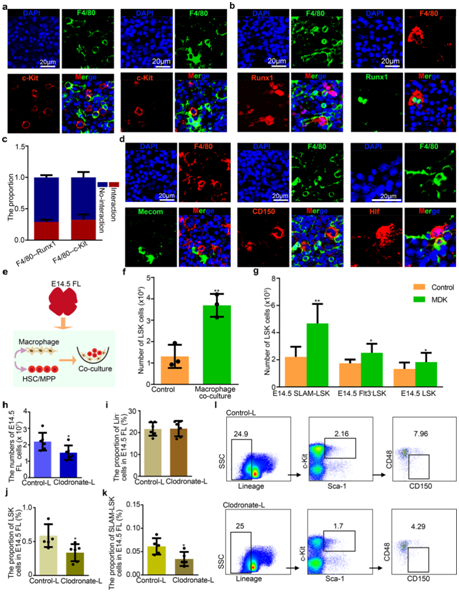 (a) 免疫荧光分析显示 E14.5 FL 冰冻切片中 F4/80(代表巨噬细胞)和 c-Kit(代表 HSC/MPP)的表达。(b) 免疫荧光分析显示 E14.5 FL 冰冻切片中 F4/80(代表巨噬细胞)和 Runx1(代表 HSC/MPP)的表达。 (c) 分别具有和不具有细胞相互作用的 HSC/MPP 的比例。 (d) 免疫荧光分析显示 E14.5 FL 冰冻切片中 F4/80(代表巨噬细胞)、CD150(代表 HSC/MPP)、Mecom(代表 HSC/MPP)和 Hlf(代表 HSC/MPP)的表达。 (e) HSC/MPP 与巨噬细胞共培养的程序示意图。(f) 巨噬细胞与HSC/MPP共培养体系中获得的HSC/MPP (LSK细胞)数量。 (g) 通过添加MDK (50 ng/mL)培养100个HSC /MPP (LSK、Flt3-LSK和SLAM-LSK细胞)获得的HSC /MPP(LSK细胞)数量。(h) 氯膦酸盐脂质体和对照脂质体处理后 E14.5 FL 中的总细胞数。 (i) 氯膦酸盐脂质体和对照脂质体处理后,E14.5 FL 中谱系– (Lin–) 细胞的比例。(j) 氯膦酸盐脂质体和对照脂质体处理后 E14.5 FL 中 LSK 细胞的比例。 (k) 氯膦酸盐脂质体和对照脂质体处理后 E14.5 FL 中 SLAM-LSK 细胞的比例。 (l) 流式分析。