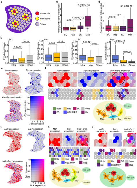 为了定量比较 HSC/MPP 和不同生态位细胞之间的相互作用,他们根据每种斑点类型的富集得分中位数与所有斑点的富集得分中位数的比率定义了富集倍数。他们发现巨噬细胞在点内富集11.52倍,在点间富集1.31倍,EC在点内富集1.62倍。而肝母细胞和间质细胞在点内富集较少(图4c-d)。