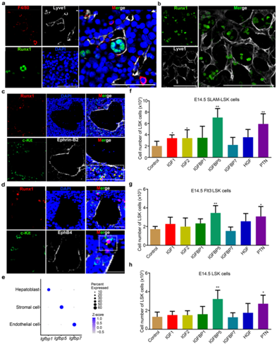 (a-b) 免疫荧光分析显示 E14.5 FL 冰冻切片中 Lyve1(代表 EC)和 Runx1(代表 HSC/MPP)的表达。(c) 免疫荧光分析显示c-Kit(代表HSC /MPP)、Runx1(代表HSC/MPP)和EphrinB2(代表动脉门静脉血管)在E14.5 FL冷冻切片中的表达。 (d) 免疫荧光分析显示c-Kit(代表HSC /MPP)、Runx1(代表HSC /MPP)和EphB4(代表静脉)在E14.5 FL冷冻切片中的表达。 (e) Igfbp1、Igfbp5和Igfbp7在三种结构生态位细胞(内皮细胞、基质细胞和肝母细胞)中的表达模式的点阵图。(f) 来自 E14.5 FL 的 100 个 SLAM-LSK 细胞补充因子(每种因子 50 ng/mL)培养物的 HSC/MPP(LSK 细胞)数量。 (g) HSC/MPP(LSK 细胞)的数量源自补充因子(每种因子 50 ng/mL)的 100 个 Flt3 – E14.5 FL 的 LSK 细胞培养物。 (h) 来自 E14.5 FL 的 100 个 LSK 细胞补充因子(每种因子 50 ng/mL)培养物的 HSC/MPP(LSK 细胞)数量。