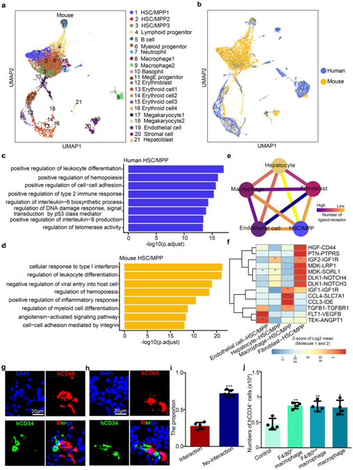 (a) 小鼠 E14.5 FL 中所有细胞类型的 UMAP 可视化。 (b) 来自小鼠(E14.5)和人类(受孕后 11 周)的 FL 细胞群的 UMAP 可视化。(c) 对人类 HSC/MPP 中与生物过程相关的顶级 DEG 进行 GO 分析。 (d) 对小鼠 HSC/MPP 中与生物过程相关的顶级 DEG 进行 GO 分析。(e) 配体-受体相互作用网络显示人类 HSC/MPP 与微环境细胞之间的潜在通信。 (f) 热图显示主要的人类 HSC/MPP−生态位细胞相互作用对。(g-h) 免疫荧光分析显示人类受孕后 11 周 FL 切片中 CD68(代表巨噬细胞)和 CD34(代表 HSC/MPP)的表达。 (i) 分别具有和不具有细胞相互作用的 HSC/MPP 的比例。(j) 来自小鼠巨噬细胞和 HSC/MPP 共培养系统的人 CD34 + HSC/MPP数量。