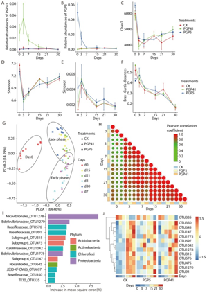 为了探究PGPB和植物发育对微生物组的影响,本研究探究了接种及植物栽培处理后30天内根际微生物组的变化。两种菌剂(菌株PGP5和PGP41)在第3天均检测到高丰度,随后迅速下降至对照土壤中的相同水平,表明菌剂在土壤中未能生长(图 1A, B)。α-多样性的测量揭示了植物发育过程中多样性随时间的变化(图 1C-E)。原始细菌群落(第0天)的α-多样性最高,而第3天群落最低。从第3天到第30天,所有群落的α-多样性均随时间增加而增加。植物培养处理(CK)与接种菌株PGP5 (PGP5)或菌株PGP41 (PGP41)处理的样品之间没有显著变化。15-30天后期的α-多样性变化较0-7天前期平缓,表明根系微生物逐渐趋于稳定。β-多样性分析也揭示了类似的结果(图 1F-H)。在所有土壤样品的主坐标分析(PCoA)中,第0天的样品聚集在一起,在第一坐标轴上远离植物居留(不同时期CK、PGP5、PGP41)的样品(图 1G)。对于有植物残留的土壤样品,在第二坐标轴上,晚期样品在植物发育阶段上偏离早期样品较远,在早期和晚期之间的边缘有重叠(图 1G)。不同处理的土壤样品未检测到分离,表明植物根际微生物组发育依赖在处理间的变化趋势一致。此外,在处理结束(第30天)时采集的所有处理根际微生物组与各时间点采集的根际微生物组之间的距离随着植物停留时间的增加而减小(图 1F)。此外,两两相关分析表明,无论是否接种,在根系发育的第3天,根际微生物组发生了显著变化,然后在根系发育的第15天之后逐渐趋于稳定(图 1H)。随后,进一步利用随机森林模型确定了与根系停留时间相关的操作分类单元(OTU),共检测到13个OTU。虽然前期相对丰度较低,但大部分OTUs在后期仍保持较高水平(图 1J)。在接种处理的样品中也检测到了后期高于前期的模式(图 1J)。这些结果表明,根际隔室对根际微生物组可能具有募集作用,在根系与特定细菌形成亲密关系后稳定了根际微生物组。